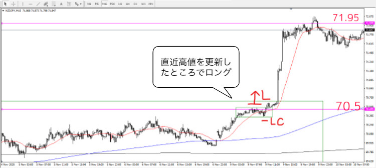 70.5ラインで抵抗を受け短期的にクラスタを発生させ、しっかり「足がかり」をつけていたので、一度下に振った後、高値を更新したところでロング。